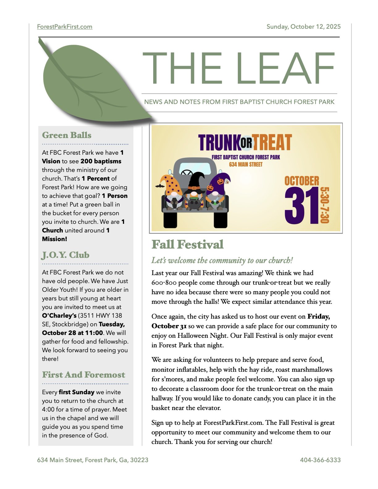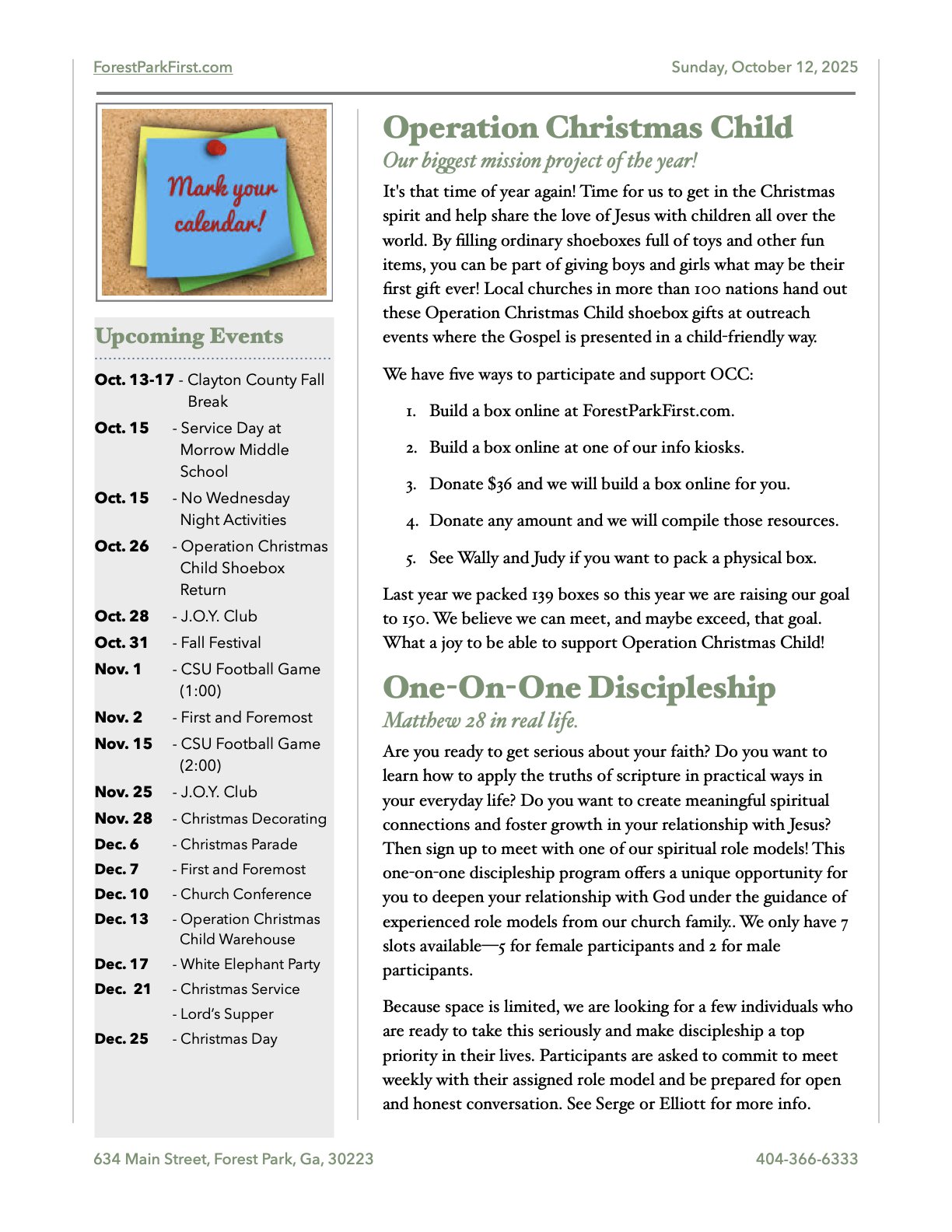 There's always something great happening for you and your family at FBC Forest Park. Stay up-to-date with our announcements and explore our full calendar of upcoming services and events below!